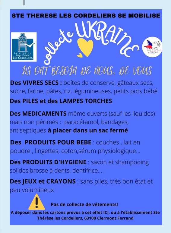 Vous êtes nombreux à vous joindre à nous pour ce magnifique projet de solidarité en collectant des dons au profit des Ukrainiens. Nous vous en remercions sincèrement. Ces produits sont ensuite triés et conditionnés par nos élèves volontaires et les adultes, pour être expédiés par le Secours Populaire.