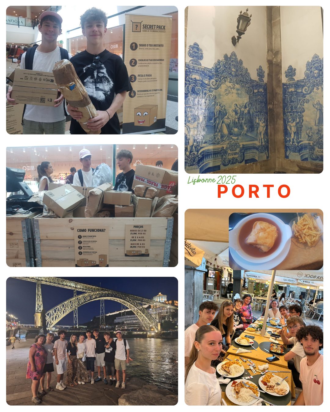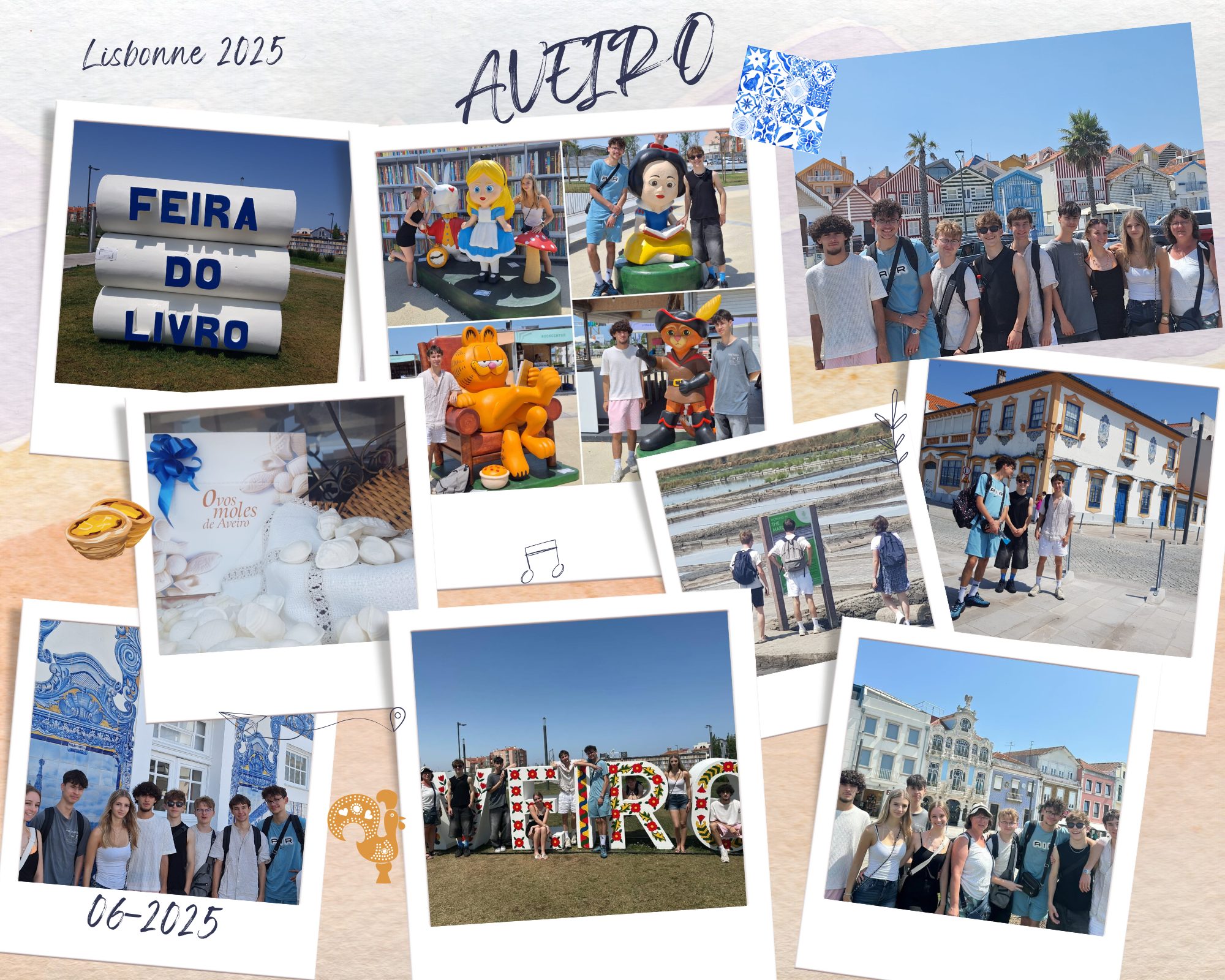 Il est temps de rentrer… Sur le retour de Lisbonne, une journée d’escale à Aveiro, la « petite Venise » du Portugal. Parcours « chasse aux trésors » mené par Elsa et les élèves de la section Accueil, autour des jolies maisons à carreaux et maisons Art Nouveau/ Art Déco, des canaux et leurs moliceiros (bateaux). Nous avons pu découvrir également la spécialité locale, les Ovo Moles (œufs mous d’Aveiro), confiserie incontournable de la pâtisserie portugaise. Nous avons assisté à la foire aux livres, évènement important de la cité, puis par la suite visité des salines et admiré les jolies maisons colorées de la Praia da Costa nova.